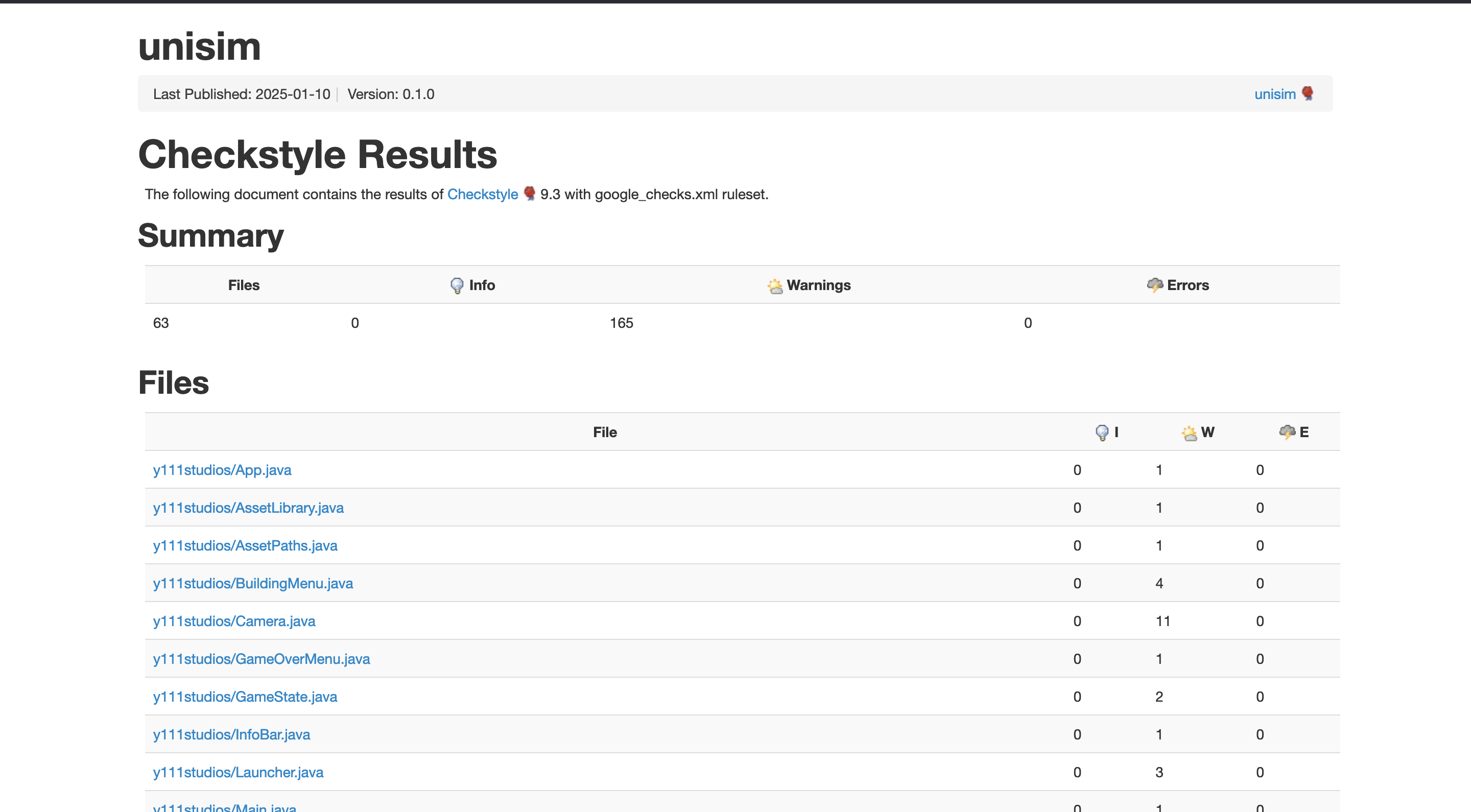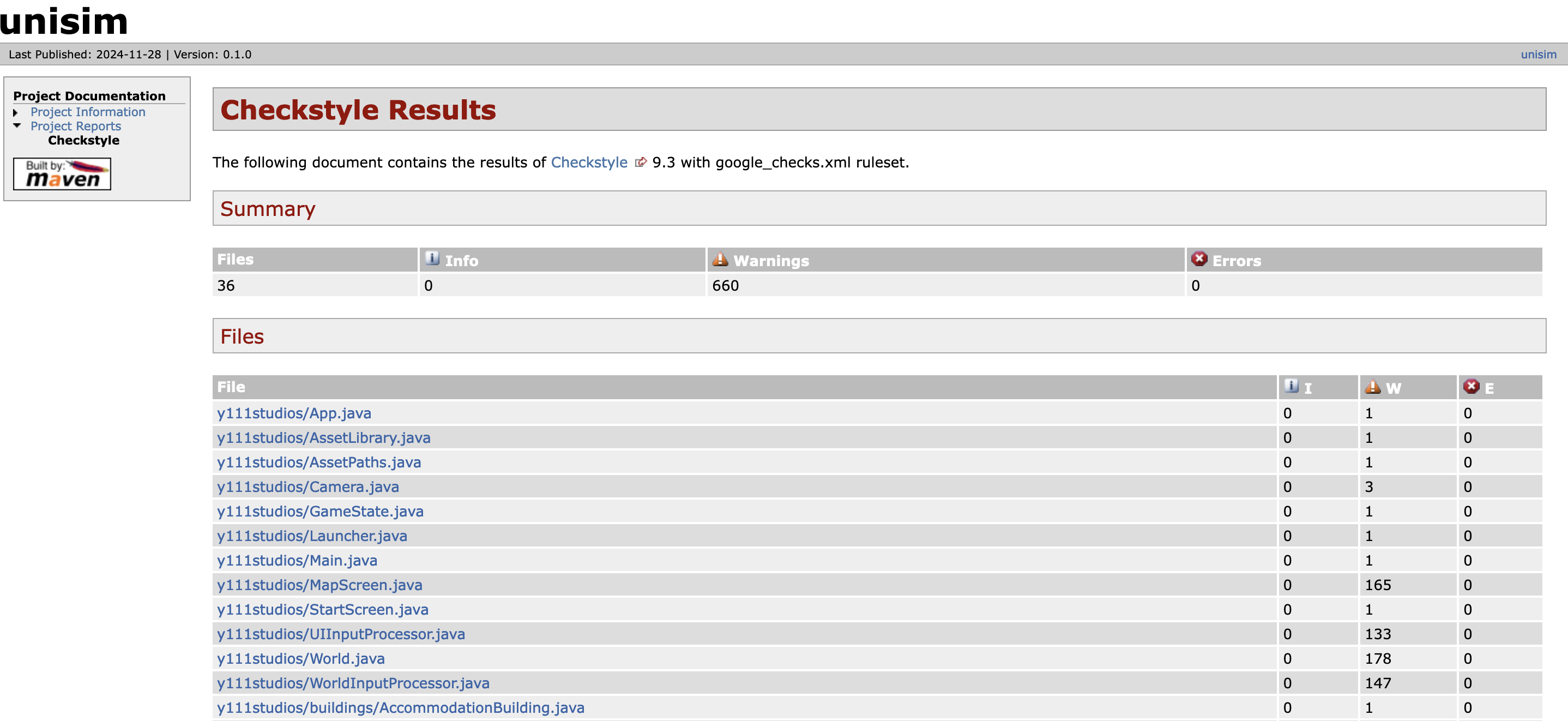 These reports are generated using checkstyle and show any formatting issues present in the code. In the second report we have achieved an average of around one issue per file, with no warnings or errors present.
